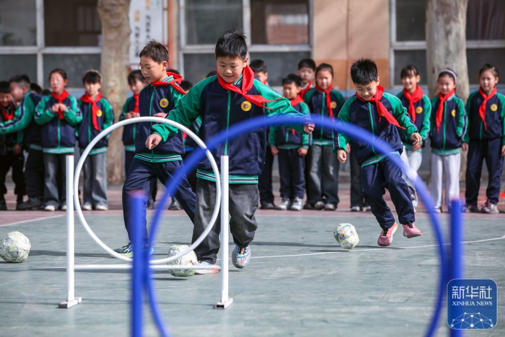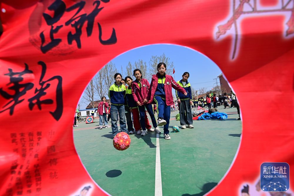 ↑ 4月3日,在河南省焦作市博愛縣清化鎮(zhèn)街道七街小學,學生們在體驗蹴鞠。新華社發(fā)(程全攝)
