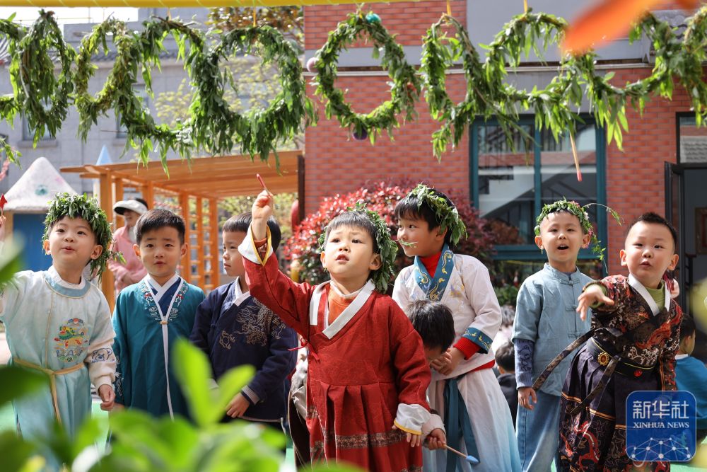 ↑ 4月3日,河南省開封市新街口幼兒園的小朋友在體驗射柳。新華社發(fā)(石斐攝)