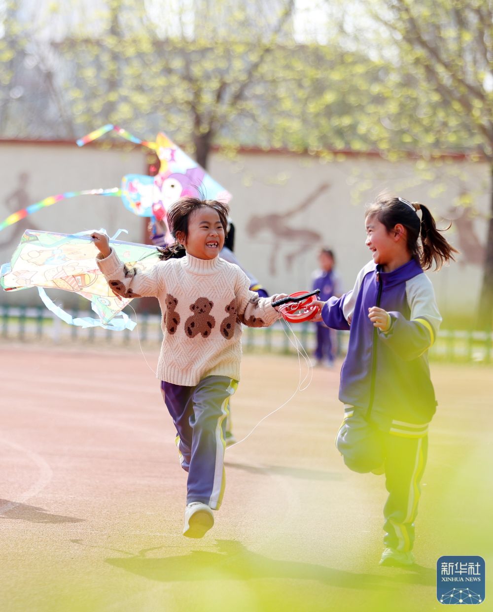 ↑ 4月3日,山東省臨沂市郯城縣第一實驗小學學生在操場上放風箏。新華社發(fā)(張春雷攝)