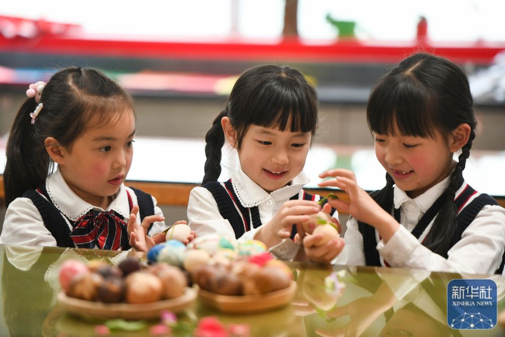 ↑ 4月3日,在浙江省金華市婺城小學,小學生在制作清明花草蛋。新華社發(fā)(時寬兵攝)