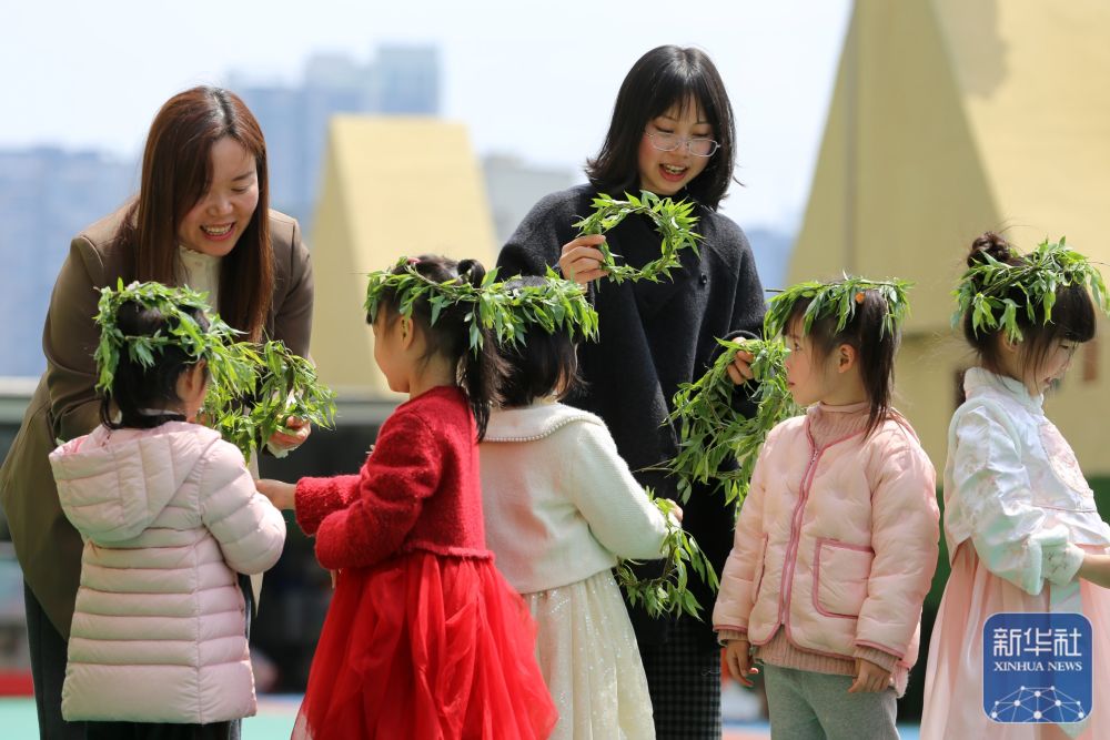 ↑ 4月2日,在山東省青島市李滄區(qū)青峰路幼兒園開展的迎清明活動中,老師指導小朋友編柳帽。新華社發(fā)(張鷹攝)