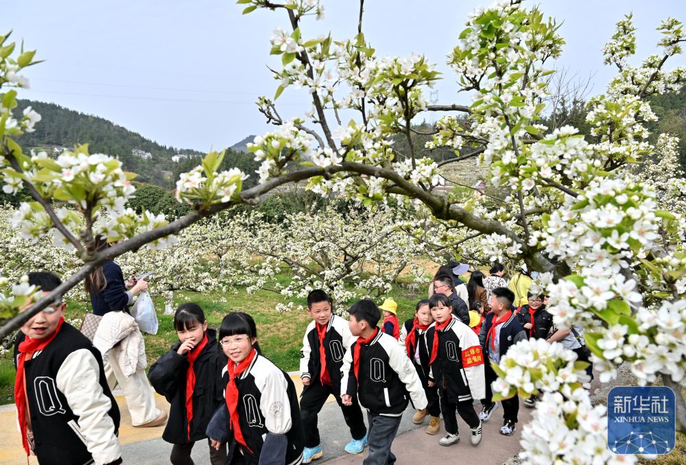 ↑ 4月2日,湖北省宣恩縣清江外國語學校的師生在黃坪村的梨園里徒步。新華社發(fā)(宋文攝)