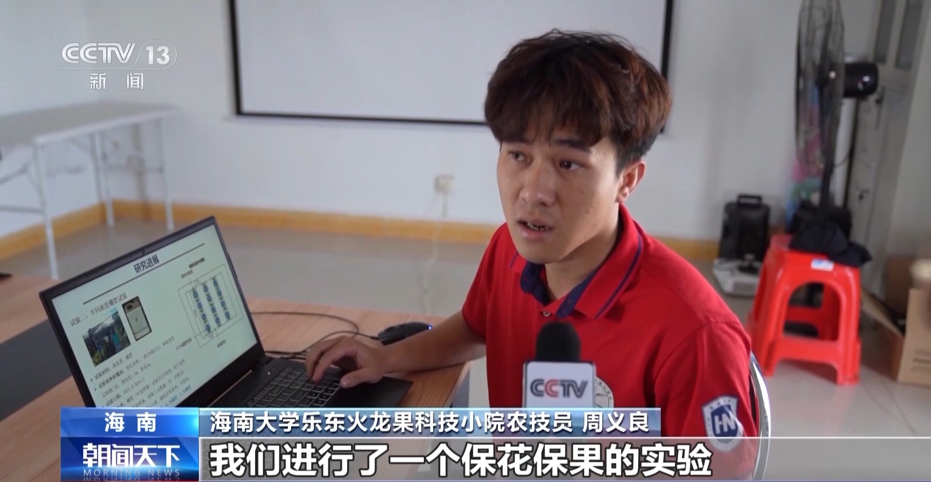 海南大學(xué)樂東火龍果科技小院農(nóng)技員 周義良:根據(jù)這個現(xiàn)狀,我們進行了一個保花保果的實驗,通過不同濃度的硼肥、氨基酸肥、授粉和溫度調(diào)控來進行實驗,坐果率提升了20%左右。