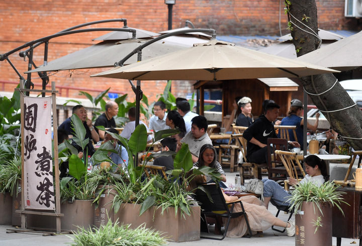 4月16日,消費者在重慶市九龍坡區(qū)謝家灣街道民主村社區(qū)一茶飲店休閑。周邦靜攝