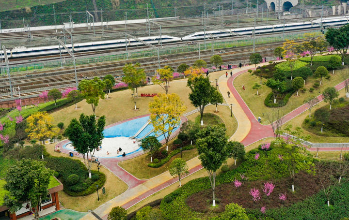 陽春三月、百花爭艷,兩江新區(qū)木桃路社區(qū)公園因靠近鐵路,形成了“開往春天的列車”的獨特景觀,引來不少市民拍照?!斑^去這里是個建筑棄渣場,社區(qū)周邊沒有休閑的地方。經(jīng)改造變成了高低錯落的山地公園,兒童樂園、健身步道、飲水等設施都有,我們現(xiàn)在散步健身有了好地方?!弊≡诟浇泥u女士滿意地說。