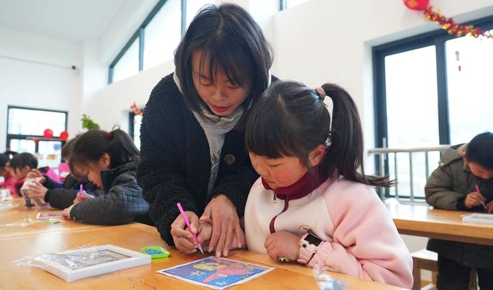 2月21日,重慶市豐都縣包鸞鎮(zhèn)“鸞媽媽”青少年家庭教育互助會志愿者在輔導孩子制作鉆石畫。豐都縣委宣傳部提供。