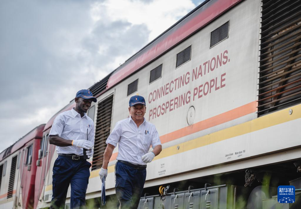 2023年5月23日,在肯尼亞內(nèi)羅畢,非洲之星鐵路運(yùn)營公司機(jī)輛部的火車駕駛員蔣立平(右)與學(xué)員霍勒斯從一輛印有“連接國家 走向繁榮”標(biāo)語的蒙內(nèi)鐵路機(jī)車旁走過。 新華社記者 王冠森 攝