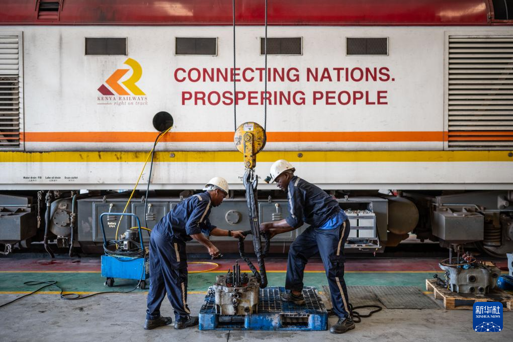 2025年1月23日,在肯尼亞內(nèi)羅畢蒙內(nèi)鐵路車間,維保人員在一輛印有“連接國家 走向繁榮”標(biāo)語的蒙內(nèi)鐵路機(jī)車前檢修配件。 新華社記者 王冠森 攝