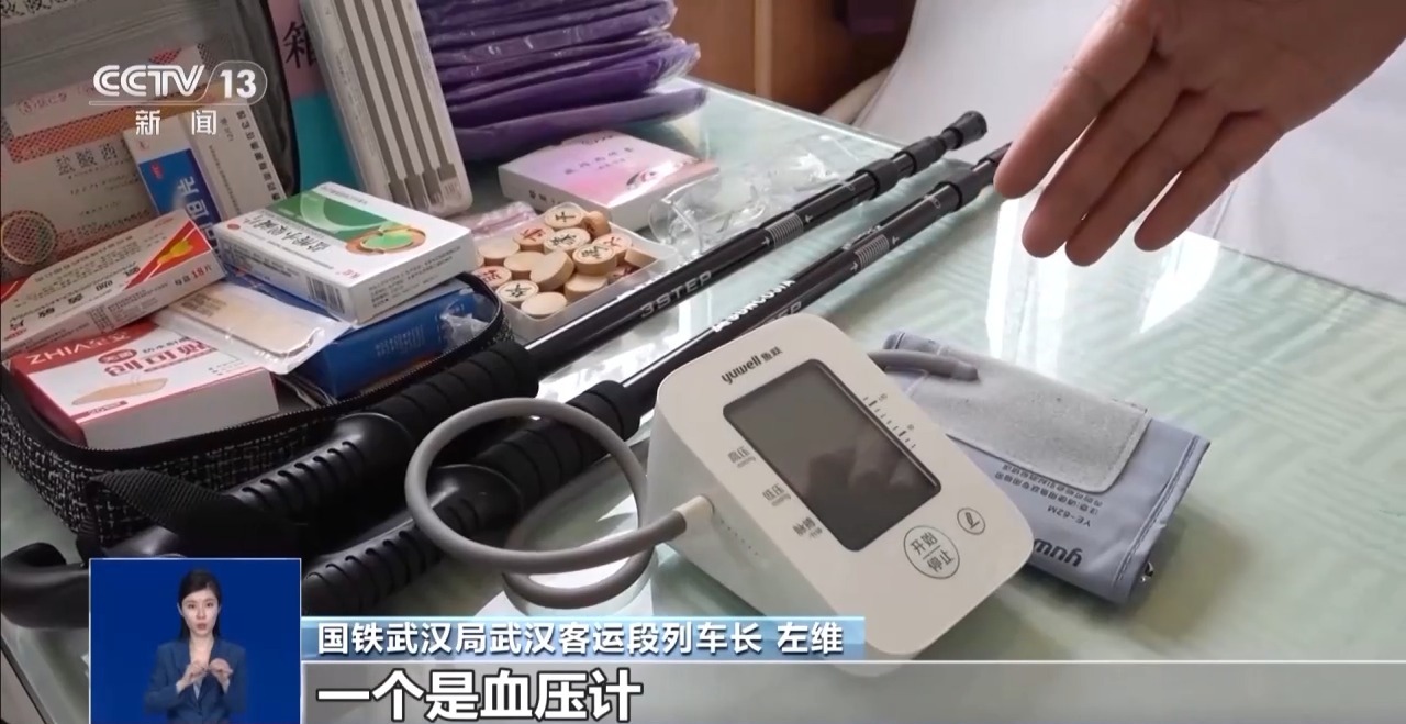 國鐵武漢局武漢客運段列車長 左維:我們列車提供了以下這些物品:血壓計、老年人經(jīng)常使用基礎藥包,在車廂里面還設置了無障礙廁所,早上還提供軟食,老年旅客更容易消化吸收。