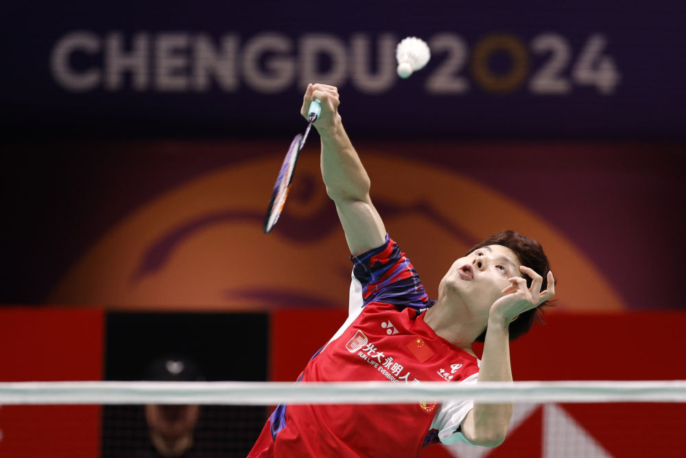 2024年5月5日,在四川成都舉行的2024年湯姆斯杯羽毛球團體賽決賽中,中國隊選手石宇奇在男子單打比賽中回球。新華社記者 沈伯韓 攝