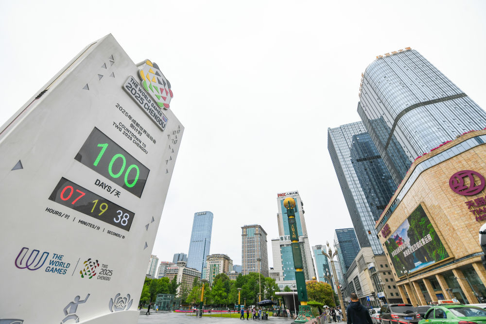 4月29日在成都天府廣場拍攝的成都世運(yùn)會(huì)倒計(jì)時(shí)電子裝置。新華社記者 王曦 攝