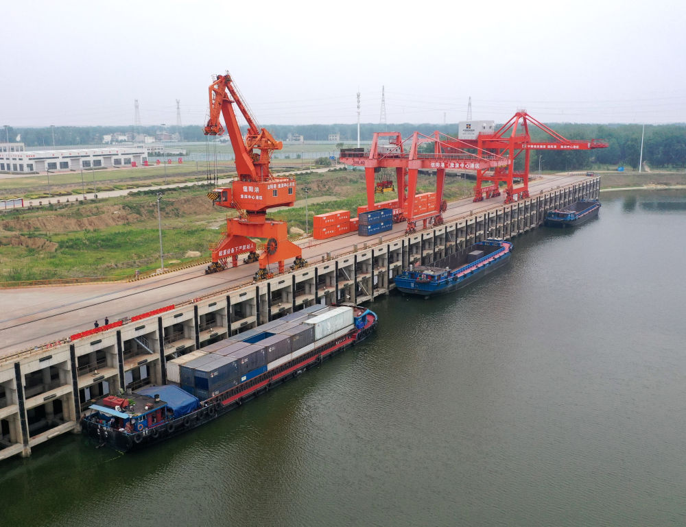 2024年6月5日,貨船停泊在信陽港·淮濱中心港內(nèi)(無人機(jī)照片)。新華社記者 李嘉南 攝
