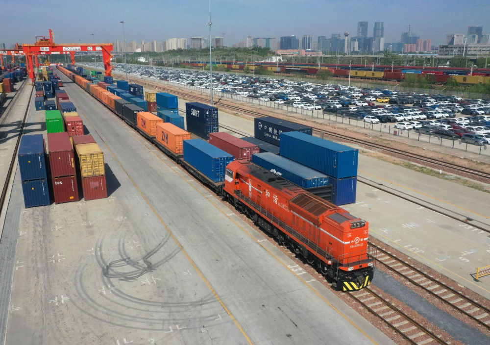 2025年4月15日,X8003次中歐班列(鄭州)??吭趪F集團(tuán)鄭州局圃田車站(無人機(jī)照片)。新華社記者 李嘉南 攝