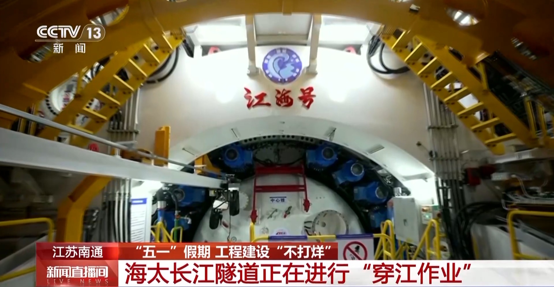 總臺記者 唐高林:江蘇南通海門區(qū)境內(nèi),靠近長江的地下深處,距離地面有30多米?!拔逡弧奔倨冢@里有三百多名工人持續(xù)奮戰(zhàn)在隧道施工一線。
