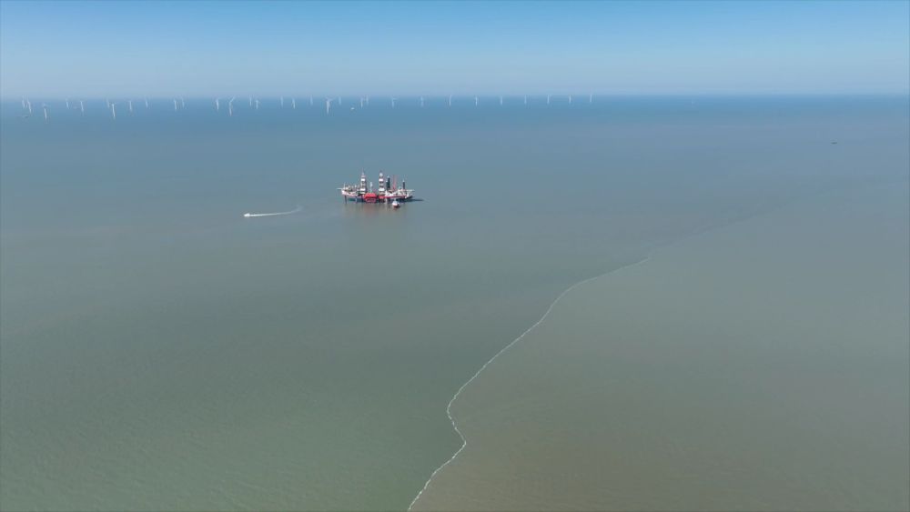 新勝利一號平臺位于山東黃河三角洲國家級自然保護區(qū)邊緣,黃河入海的地方。由于黃河水含沙量大,渾黃的河水裹挾著泥沙,和藍色的海水相互沖擊,形成一條明顯的分界線,藍黃交匯,好似“鴛鴦鍋”。