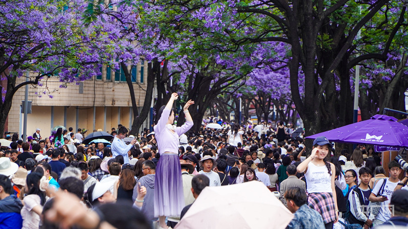 “五一”假期,前來昆明教場中路觀賞藍(lán)花楹的游客絡(luò)繹不絕(央廣網(wǎng)記者 魏文青 攝)
