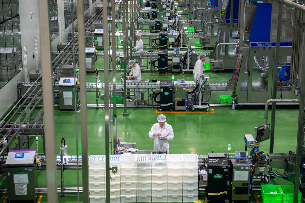 2025年4月17日,在內(nèi)蒙古呼和浩特市土默特左旗,工人在伊利現(xiàn)代智慧健康谷全球智能制造產(chǎn)業(yè)園灌裝車間內(nèi)工作。新華社發(fā)(李心逸攝)