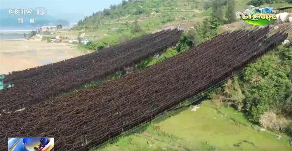 從空中俯瞰,成排鋼索從半山腰鋪架下來,層層疊疊的海帶如綠色瀑布傾瀉。與傳統(tǒng)地面晾曬相比,這種立體掛曬的方式通風(fēng)性更好,能縮短晾曬周期,還能減少泥沙附著,保持海帶潔凈干爽,提升海帶品相。