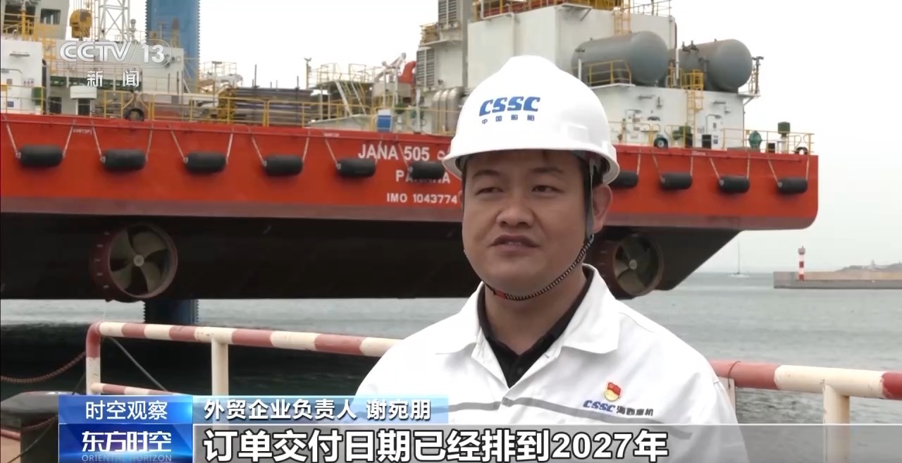 外貿(mào)企業(yè)負(fù)責(zé)人 謝宛朋:目前,在建外貿(mào)平臺(tái)及港機(jī)設(shè)備40余臺(tái),訂單交付日期已經(jīng)排到2027年。