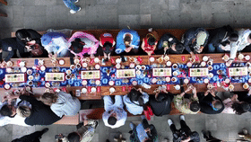 因?yàn)殡娪啊赌倪?》而火爆“出圈”的貴陽越界影城,經(jīng)常舉辦“花式寵粉”的活動(dòng)。比如在影城門口擺起具有當(dāng)?shù)靥厣摹敖z娃娃”長桌宴。