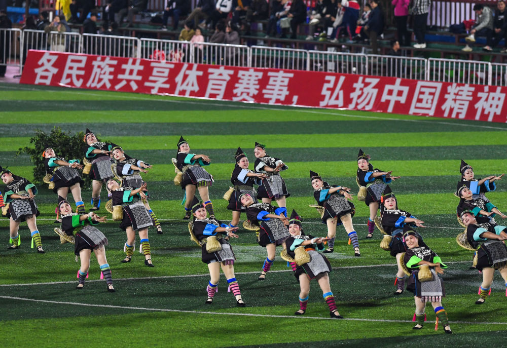 村民在貴州“村超”球場表演民族舞蹈(2025年3月14日攝)。新華社記者 楊文斌 攝