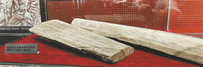 展柜中看似普通的兩塊木頭,實(shí)為文物“消息樹”。樹皮上,“中國(guó)報(bào)”等字跡仍能辨認(rèn)。