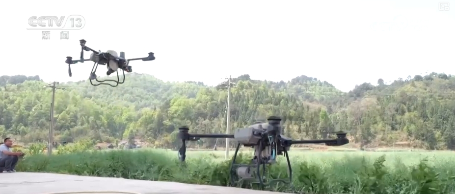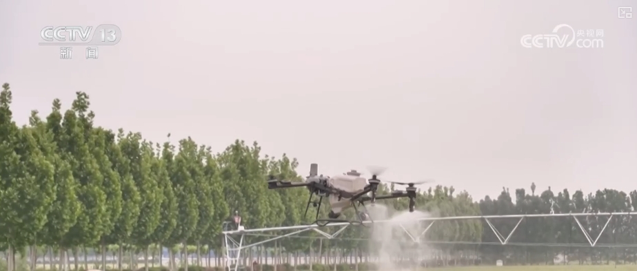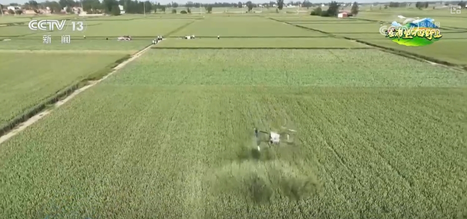 根據(jù)物聯(lián)網(wǎng)蟲情監(jiān)測系統(tǒng)提供的信息,植保無人機在麥田上精準(zhǔn)噴灑混合液。