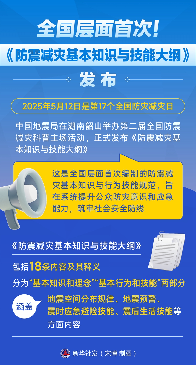 今年5月12日是第17個(gè)全國(guó)防災(zāi)減災(zāi)日。當(dāng)天,中國(guó)地震局在湖南韶山舉辦第二屆全國(guó)防震減災(zāi)科普主場(chǎng)活動(dòng),正式發(fā)布《防震減災(zāi)基本知識(shí)與技能大綱》,這是全國(guó)層面首次編制的防震減災(zāi)基本知識(shí)與行為技能規(guī)范,旨在系統(tǒng)提升公眾防災(zāi)意識(shí)和應(yīng)急能力,筑牢社會(huì)安全防線。