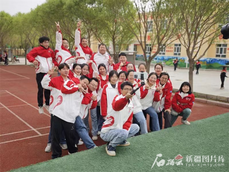 今年春季新學(xué)期開學(xué)時,謝依特小學(xué)戍邊支教西部計劃志愿者服務(wù)隊隊員們在校園內(nèi)合影留念。謝依特小學(xué)供圖
