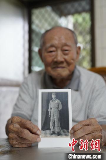 2018年5月21日,安徽合肥籍臺灣老兵金英在臺灣屏東家中為《日暮·歸鄉(xiāng)》劇組展示老照片。(片方供圖)