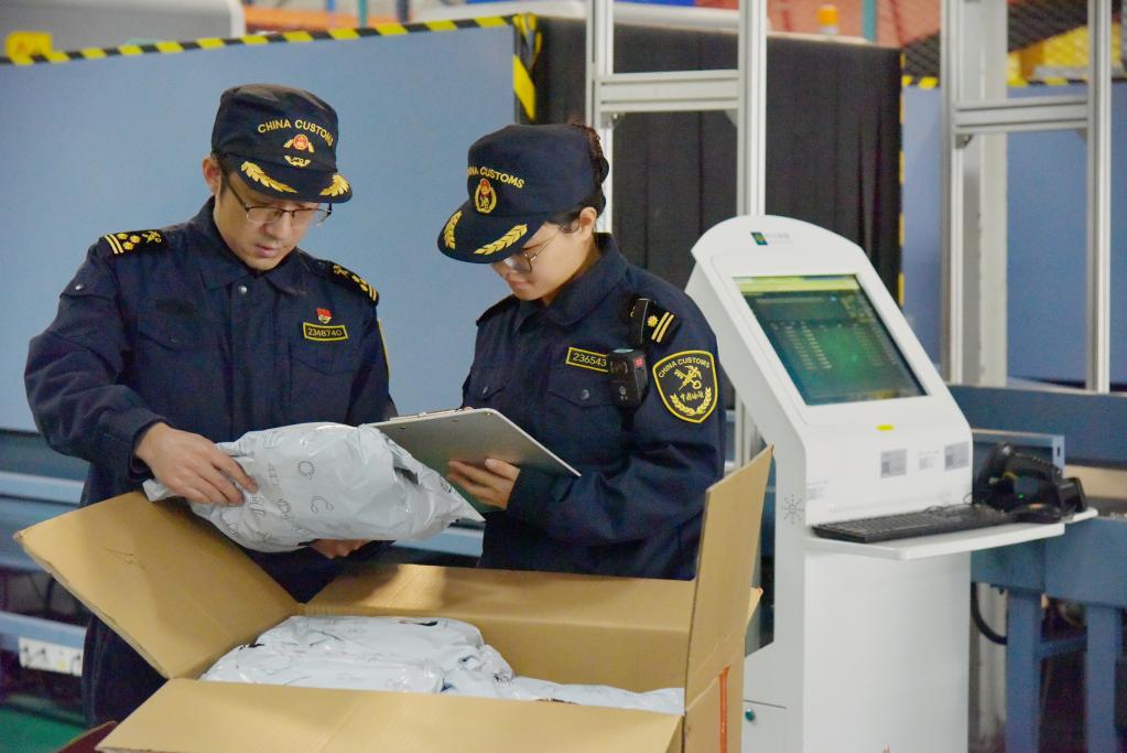 無錫海關(guān)關(guān)員對(duì)運(yùn)往墨西哥的跨境電商商品進(jìn)行查驗(yàn)(2024年12月26日攝)。新華社發(fā)