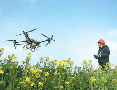 3月6日,江蘇省南通市通州區(qū)劉橋鎮(zhèn)無人農(nóng)機(jī)示范基地,種植戶在田間操控調(diào)試植保無人機(jī)。許叢軍攝(人民視覺)
