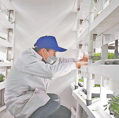 庫(kù)車市甬庫(kù)同心村智慧農(nóng)業(yè)植物工廠育苗室內(nèi),工作人員在仔細(xì)觀察幼苗。 王紅麗攝