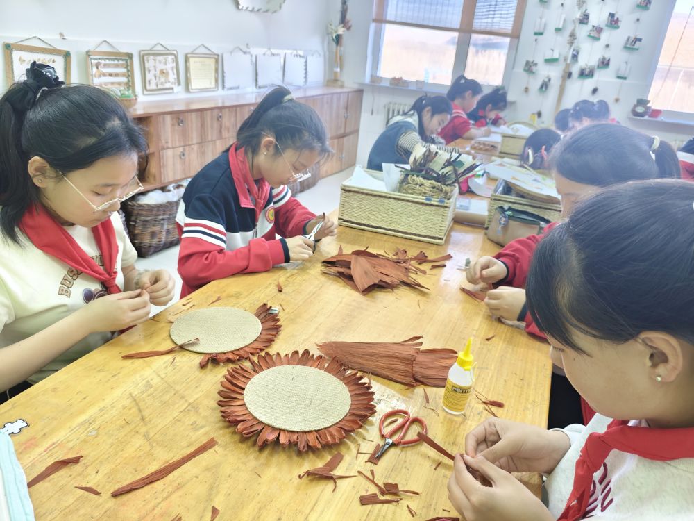 內(nèi)蒙古林西縣統(tǒng)部小學(xué)的學(xué)生正在制作玉米皮粘貼畫。(受訪者供圖)