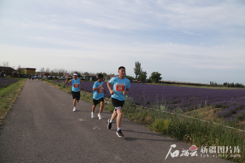 5月31日,霍城縣“2025蘇韻伊情·霞路相逢(霞2·芳香霍城)商學院越野接力賽”開跑。圖為參賽選手跑過一片薰衣草園。石榴云/新疆日報記者 宋衛(wèi)國 攝