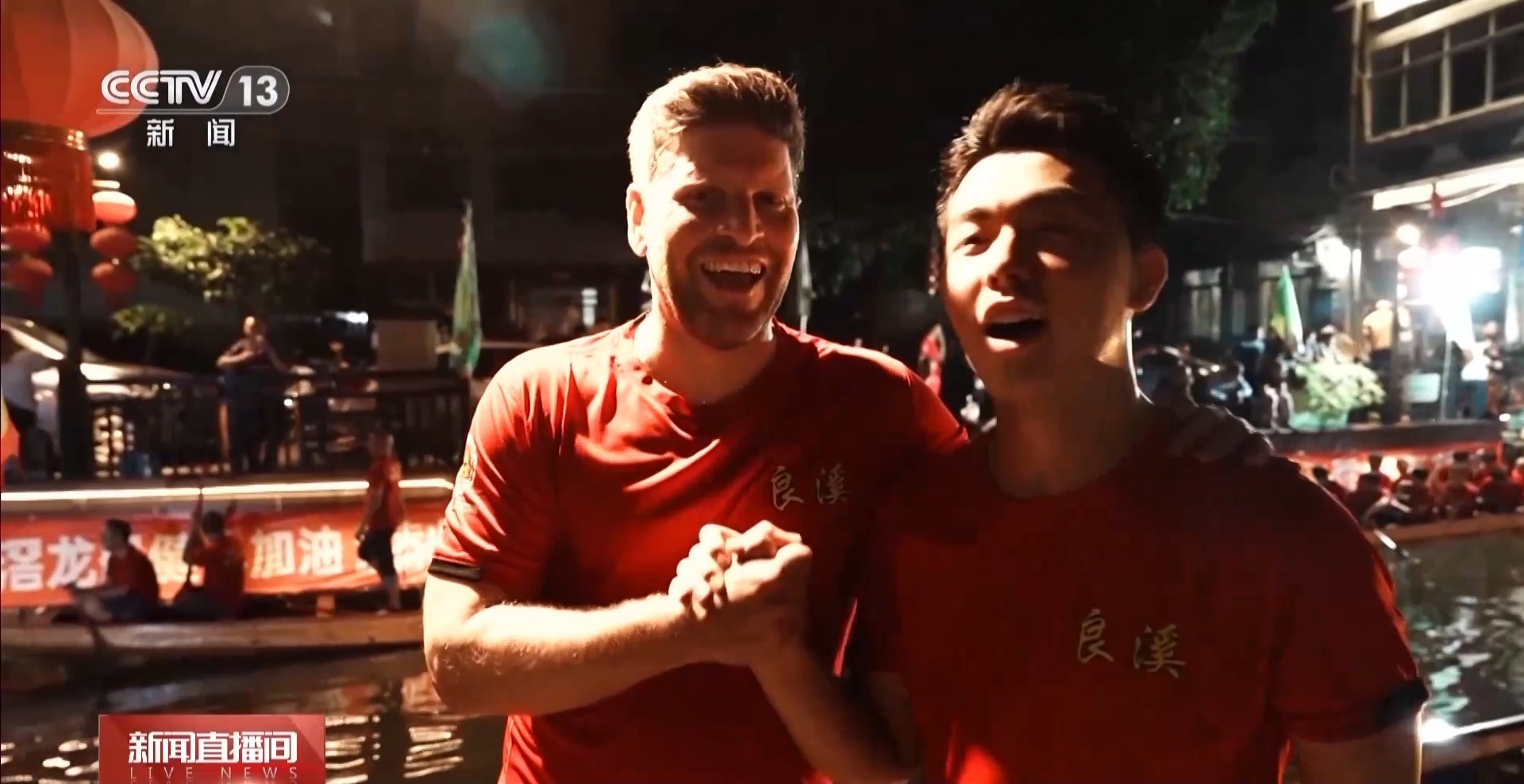 晚上8點,當記者來到佛山南海區(qū)的疊北社區(qū)時,河道兩邊已經(jīng)圍滿了觀看夜訓(xùn)的村民和游客。伴隨著鏗鏘鼓點和陣陣歡呼,隊員們揮臂劃槳、破水前行,一艘艘龍舟在河道中穿梭、漂移、折返。在激烈的競技中,一個金發(fā)碧眼的外國面孔正和中國“扒仔”們一起奮力劃行。