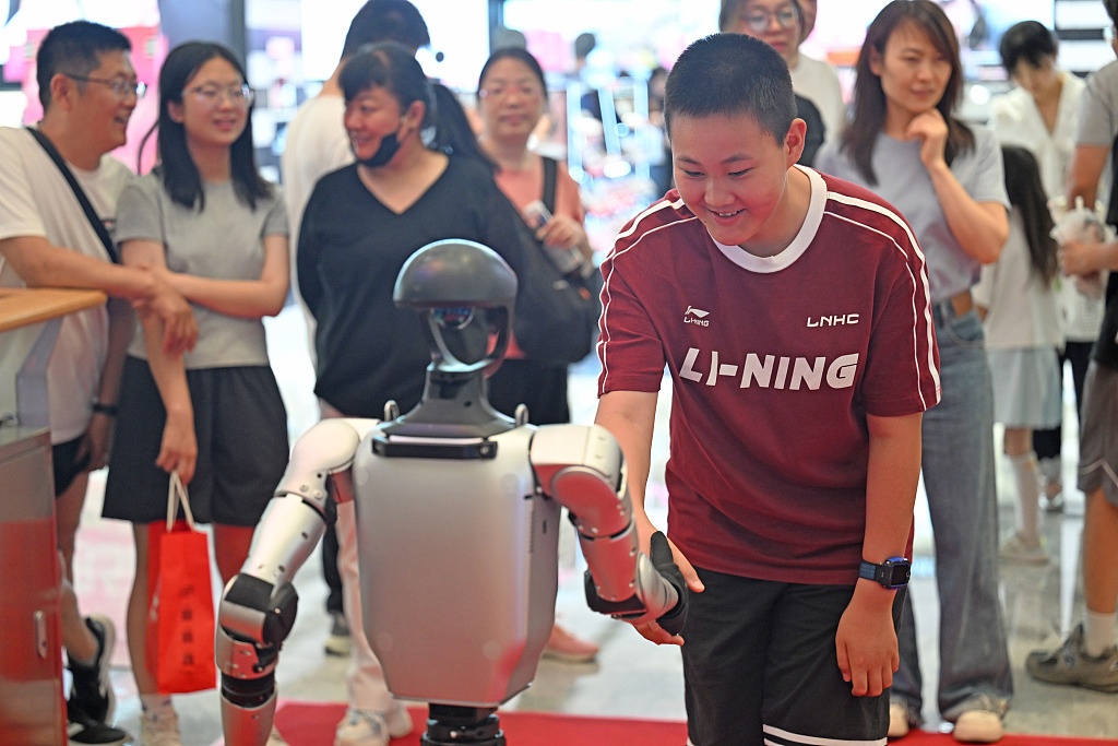 2025年5月2日,湖北宜昌的消費者與人形機器人進行互動。