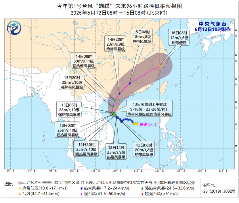 根據(jù)預報路徑,“蝴蝶”在海南島沿海首次登陸后,可能于14日白天在廣東西部到廣西沿海再次登陸,屆時強度仍將維持在強熱帶風暴級,登陸后轉向東北方向移動,強度逐漸減弱。