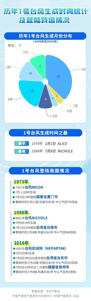 氣象上通常將當年西北太平洋及南海生成的首個編號臺風稱為“初臺”。統(tǒng)計顯示,每年1號臺風生成的時間分散在1月至7月。1979年的“初臺”在元旦當天就生成了,而1998年的“初臺”則直到7月9日才出現(xiàn)。常年平均“初臺”生成時間為3月25日,從這個角度看,今年第一個臺風有點姍姍來遲了。