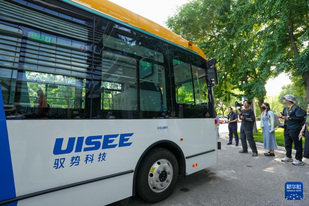 6月16日,參觀者在體驗北京馭勢科技的一款無人駕駛巴士。新華社記者 鞠煥宗 攝
