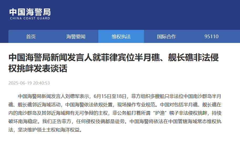 中國(guó)海警局新聞發(fā)言人劉德軍表示,6月15日至18日,菲方組織多艘船只非法位中國(guó)南沙群島半月礁、艦長(zhǎng)礁鄰近海域活動(dòng),中國(guó)海警依法依規(guī)處置,現(xiàn)場(chǎng)操作專業(yè)規(guī)范。中國(guó)對(duì)包括半月礁、艦長(zhǎng)礁在內(nèi)的南沙群島及其鄰近海域擁有無(wú)可爭(zhēng)辯的主權(quán),菲公務(wù)船打著所謂“護(hù)漁”幌子非法侵權(quán)挑釁,持續(xù)破壞南海穩(wěn)定。我們正告菲方,任何侵權(quán)伎倆都是徒勞。中國(guó)海警將依法在中國(guó)管轄海域常態(tài)維權(quán)執(zhí)法,堅(jiān)決維護(hù)領(lǐng)土主權(quán)和海洋權(quán)益。