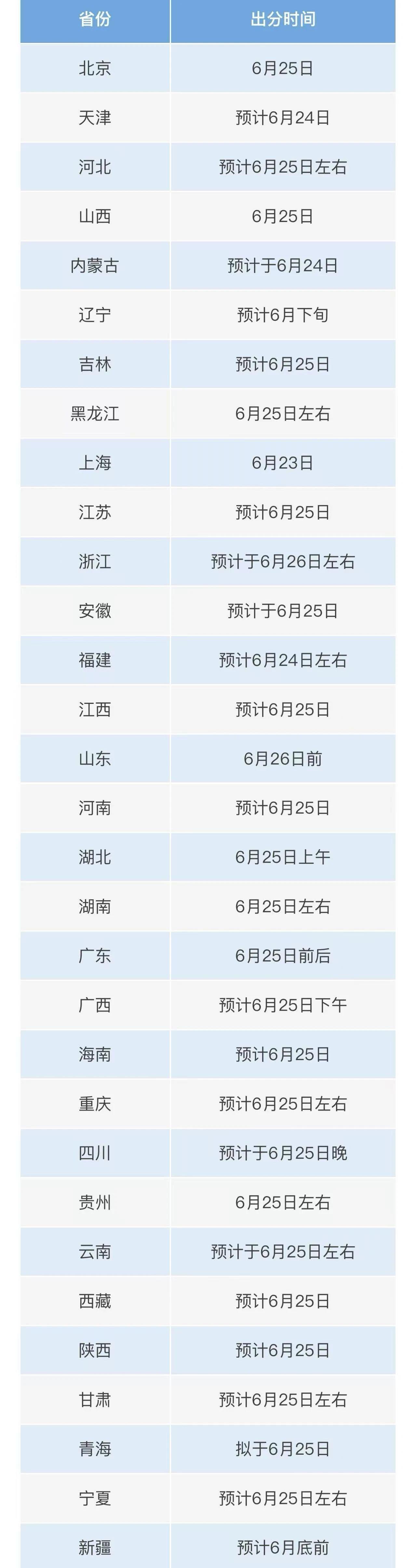 31個(gè)省份高考成績(jī)查詢時(shí)間