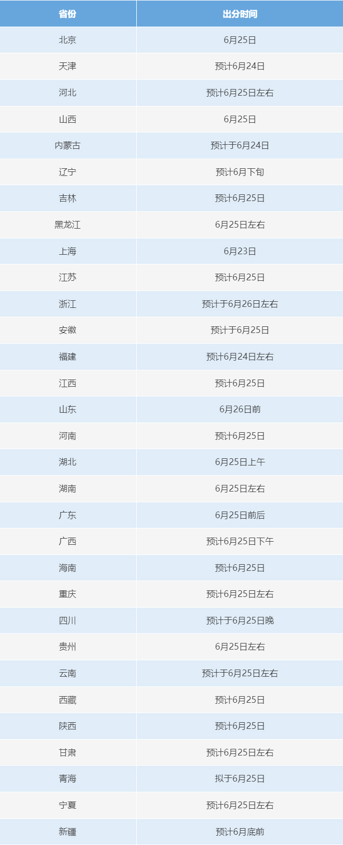 31個省份高考成績查詢時間