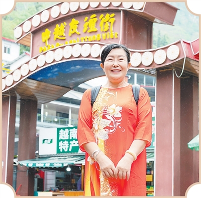 身著“奧黛”的中國游客在中越友誼街前留影。