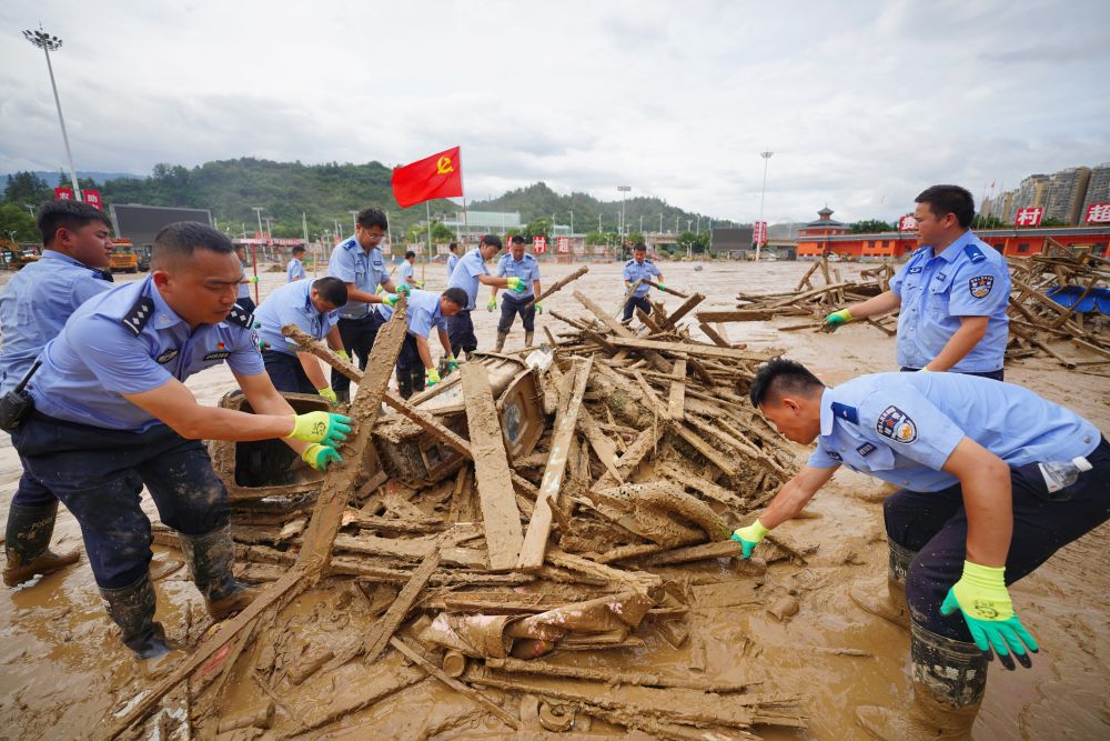 6月29日,在貴州省榕江縣“村超”球場(chǎng),來自丹寨縣公安局的黨員民警潘建航(左二)和同事一起清理因洪災(zāi)受損的球場(chǎng)設(shè)施。新華社發(fā)(楊武魁攝)