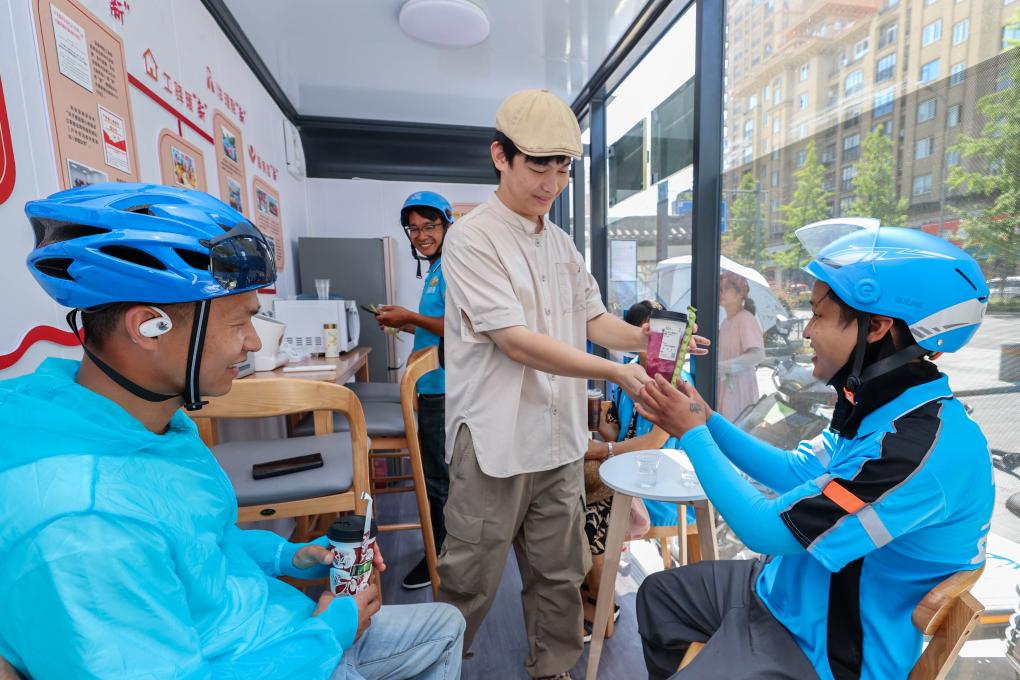 7月2日,在浙江省湖州市德清縣總工會(huì)設(shè)置的工會(huì)驛站里,愛心商家為外賣小哥送上冷飲。新華社發(fā)(姚海翔攝)