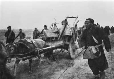 香城固戰(zhàn)役中群眾向前線運(yùn)送物資。中國人民抗日戰(zhàn)爭(zhēng)紀(jì)念館供圖