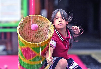 廣西龍勝各族自治縣龍勝鎮(zhèn)第二小學(xué),一名學(xué)生在大課間練習(xí)接繡球。新華社發(fā)
