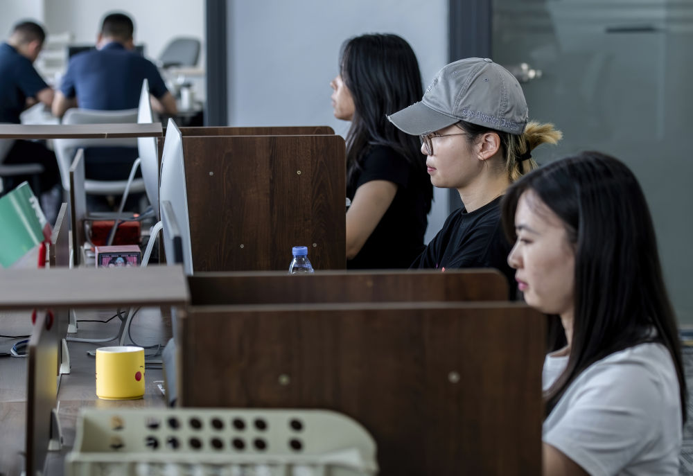 來自華僑大學(xué)的臺(tái)灣學(xué)生(右二)在廈門“臺(tái)青創(chuàng)客家”里實(shí)習(xí)(2024年6月14日攝)。新華社記者 魏培全 攝
