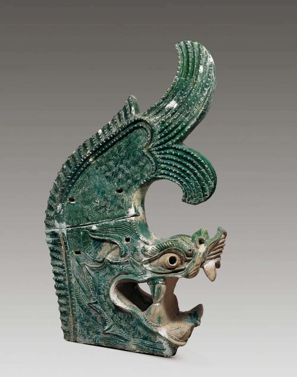 在中國國家博物館“古代中國”基本陳列上,一件出土于西夏陵6號陵的綠釉鴟吻十分顯眼。作為西夏陵的一個建筑構件,它形體高大,既與同時期中原地區(qū)的鴟吻相似,又具有龍頭比例更大、魚尾分叉等方面的獨創(chuàng)性。